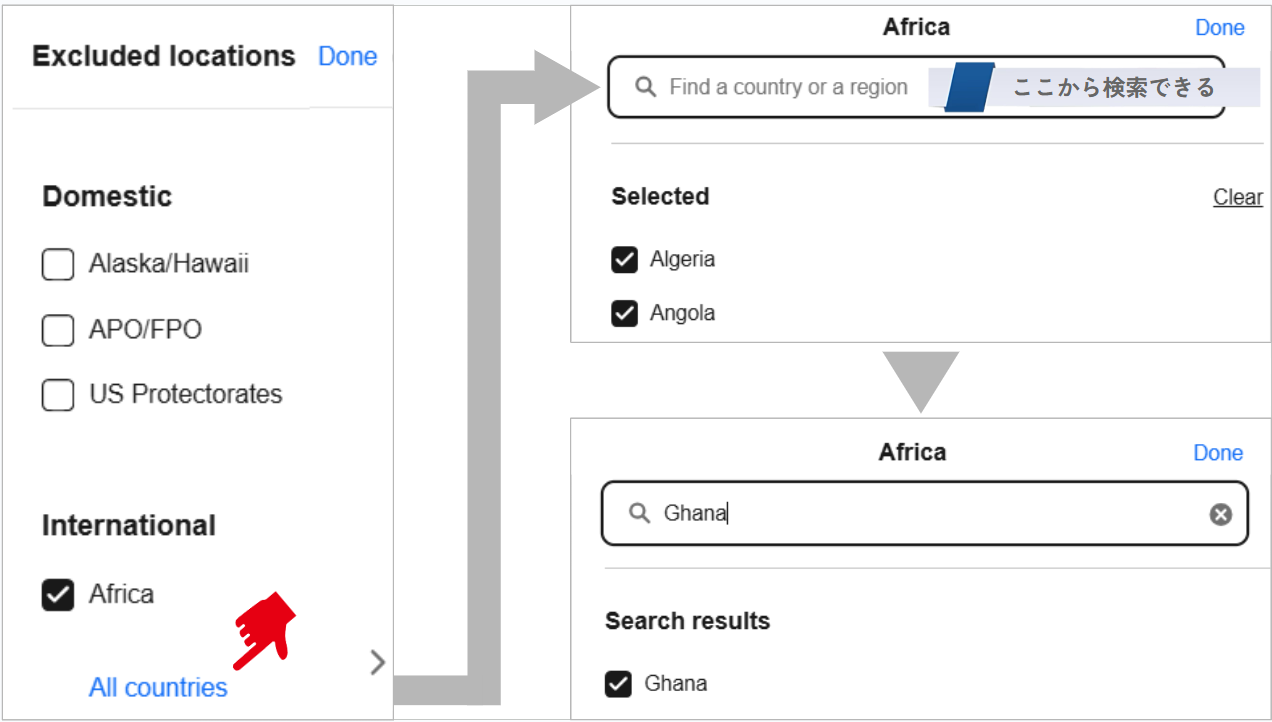 画面上部に検索できるところがあるので、エリア表からコピペして発送を許可する国のチェックを外していってください。