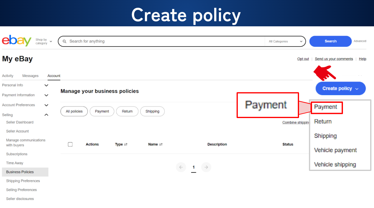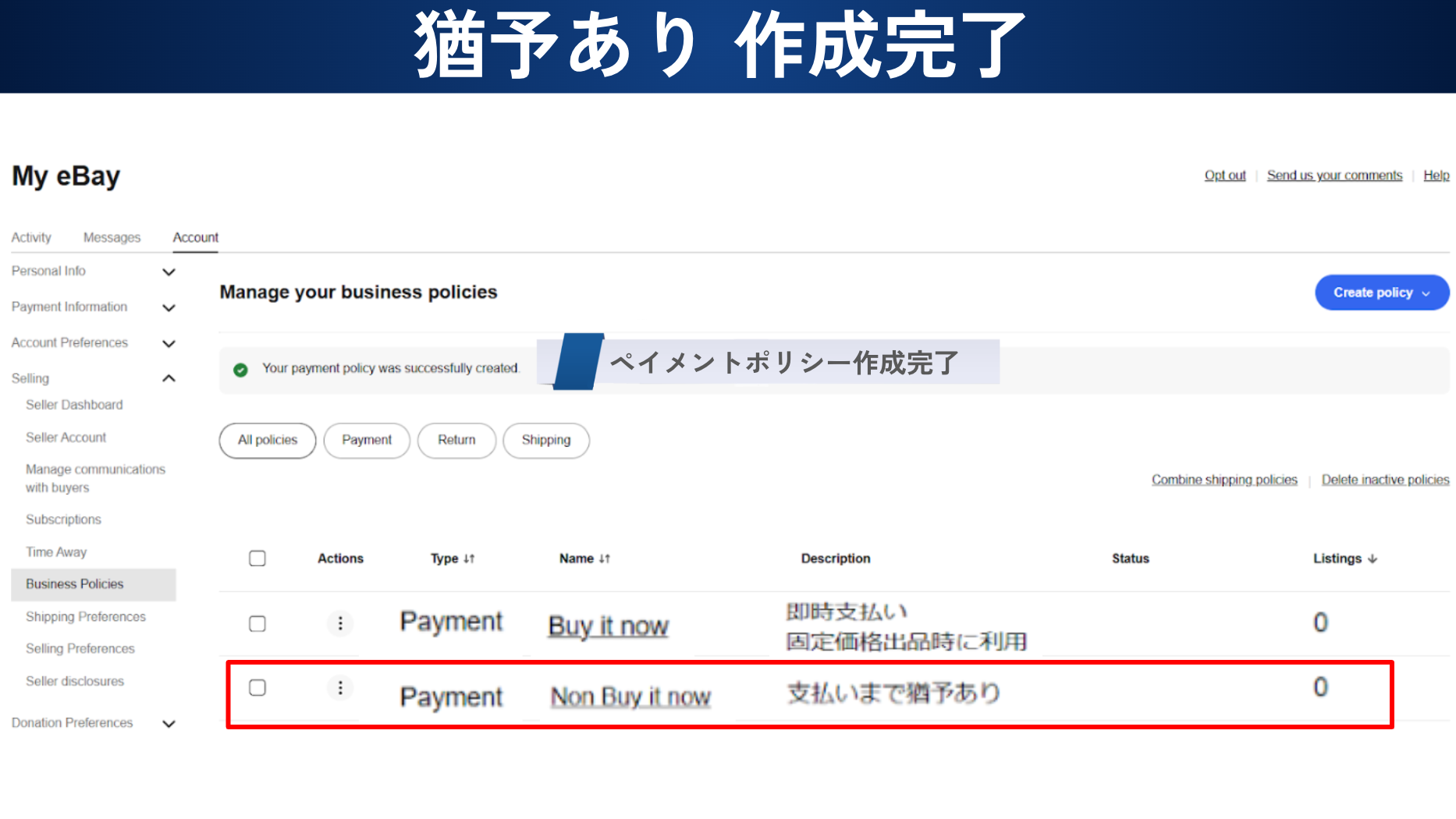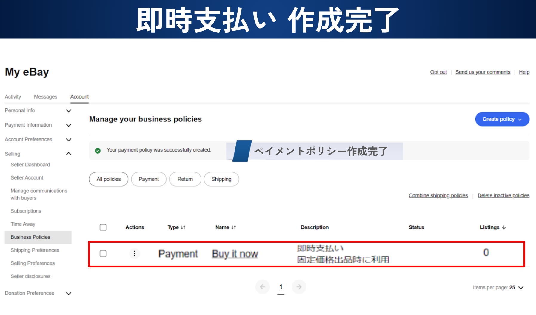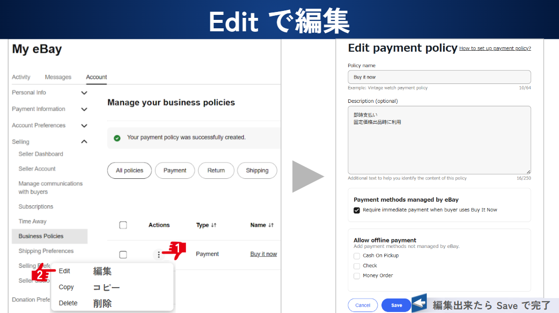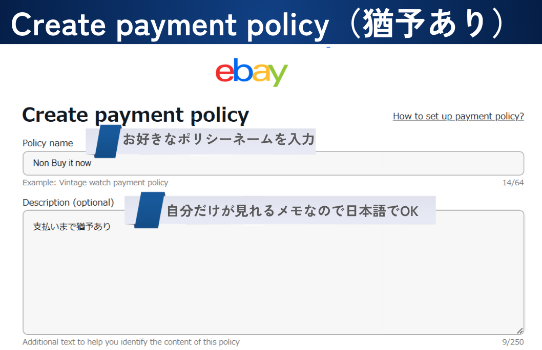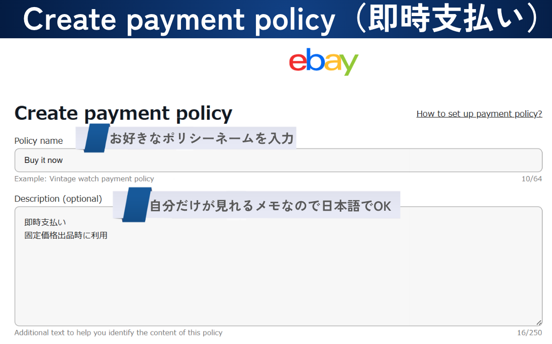 今回は eBay ビジネスポリシーの ペイメントポリシー (支払いのポリシー)の作成方法を解説していきます。