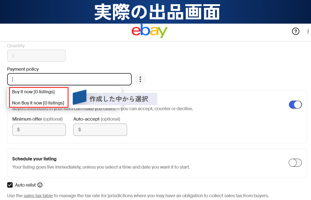 なのでオークションは即時支払いの ペイメントポリシー は選択できません。