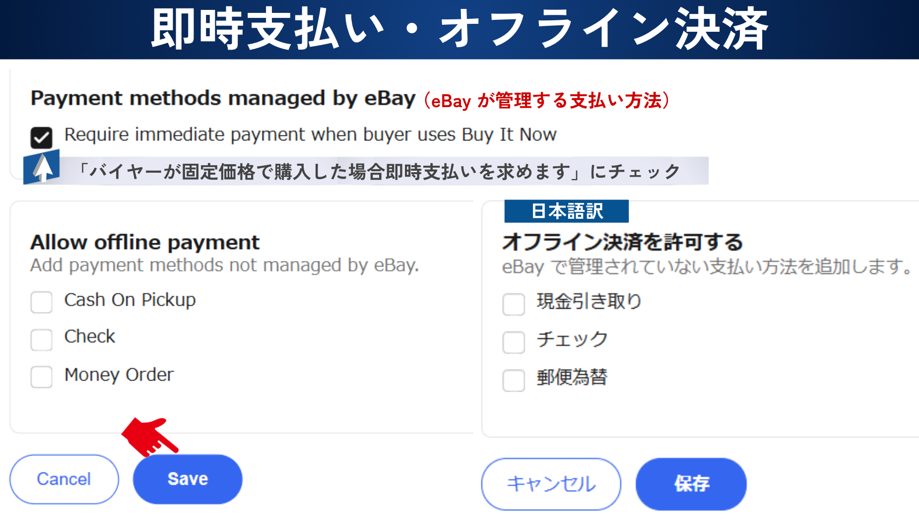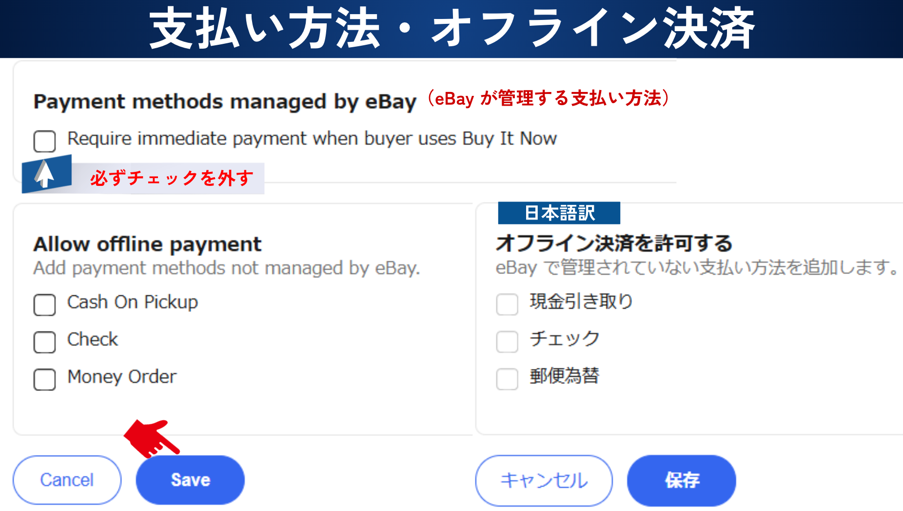 eBay が管理する支払い方法、ここは必ずチェックを外してください。